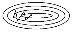 SGDには谷間をナビゲートする上で問題があります。谷間とはつまり、表面がカーブしているエリアのことで、ある次元では他の次元よりカーブがもっと急峻になっています4。これは、局所的最適の周辺ではよくあることです。このようなシナリオでは、図2のように局所的最適に向かう谷底周辺ではSDGが遅々として進まず、SGDは谷間の傾斜を横切って行ったり来たりしています。