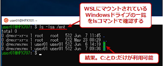 WSLを起動すると、ローカルのハードディスクやSSD上に存在して、ドライブ文字を割り当てられているNTFSやFATなどの固定ボリュームはWSL用に自動マウントされる。マウント先は、例えば「C:」ドライブなら「/mnt/c」、「D:」ドライブなら「/mnt/d」、……などとなっている。